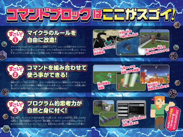 遊ぶだけでプログラム的思考力も自然と身に付いちゃう、「コマンド」テクニックを徹底解説する、とってもわかりやすい攻略本です。スイッチ/PS4・5版など「マインクラフト統合版」すべてに対応。もちろん本文にはふりがな付き! これ一冊でコマンドやコマンドブロックの使いこなしテクがしっかりわかる!