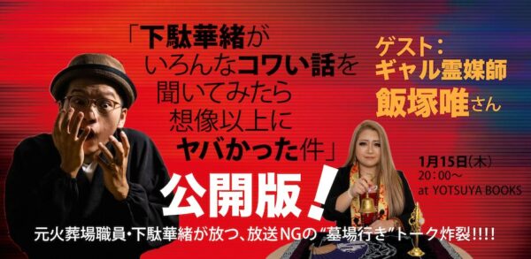 怪談界の異端児、元火葬場職員という異色の経歴を持つ下駄華緒が、ホラーの枠を超え、サブカル、アウトロー、そして芸能界のドス黒い裏側まで掘り下げるトーク番組の「公開版」がYOTSUYA BOOKSにて開催されます!