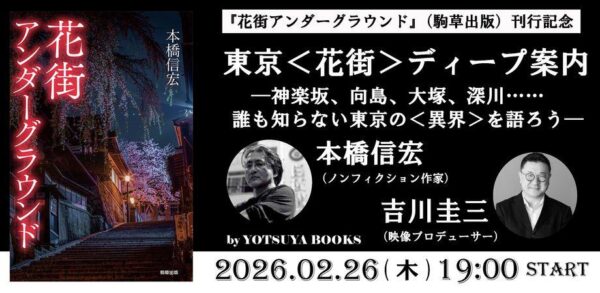 その『花街アンダーグラウンド』刊行を記念して、著者の本橋さんと、日本テレビの名プロデューサーとして活躍した一方、幼い頃から<花街>の近くで過ごし、人一倍の愛着を持つ映像プロデューサー。吉川圭三さんが、組めども尽きせぬ<花街>のディープな世界に皆さんをご案内する一夜。